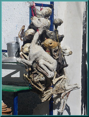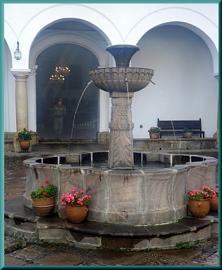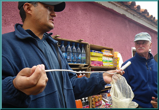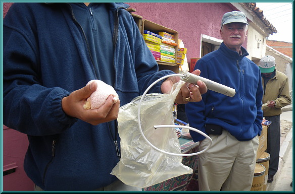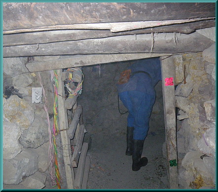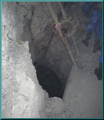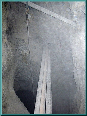 ( mine was a capful of vodka ). Now .... what about those 2 holes ? Wellllll ... that's how you get to the lower mine levels. You scoot to the edge of the hole ........ A small bucket is brought up ..... You stick one foot in the bucket .... and someone lowers you down. At least the first hole has a hand crank for a 2nd person to operate. The second hole is a "do-it-yourself". |