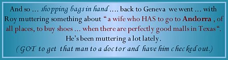 Arriving in Geneva almost a week before the rest of the group ..... we toodled around town for several days .... then hopped a plane to Barcelona to get a bus to the small country of Andorra ( located between France & Spain ). By the way, road transport is just about the only way to get there . Andorra was the only country in Europe we hadn't visited , so we thought we'd spend several days there. So we plunked ourselves down in Andorra La Vella for our stay. |