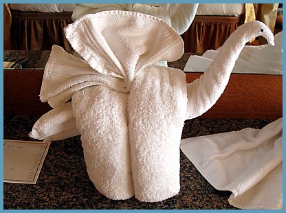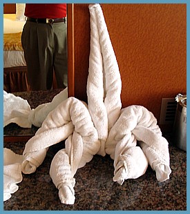 One thing we always looked forward to ... was returning to our cabins after the evenings' entertainment ... to see what the "Towel Sculpture Fairy" left us. |