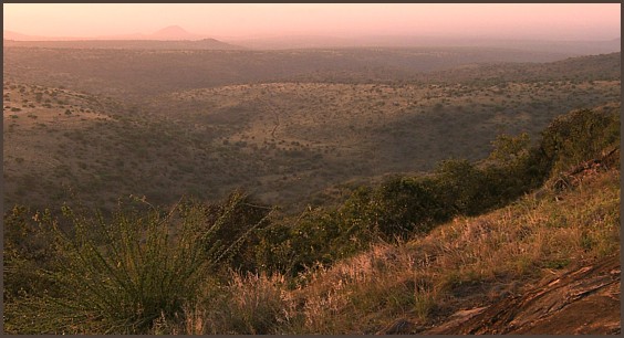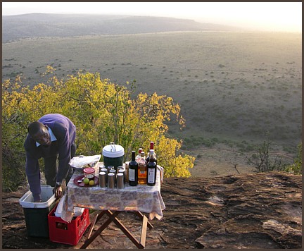 The guys set up the snacks & drinks ( "sundowners" ) on the edge of this cliff. Watching the sun set from that vantage point .... you can't help but feel a strong connection to the elemental forces of nature and the beginnings of time. It's an experience like no other .... and highly addictive. ( Have lost count of the number of safaris and locations we've been to .... but it's different each time and never "gets old".) |