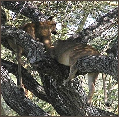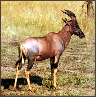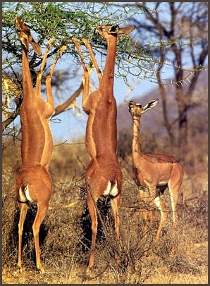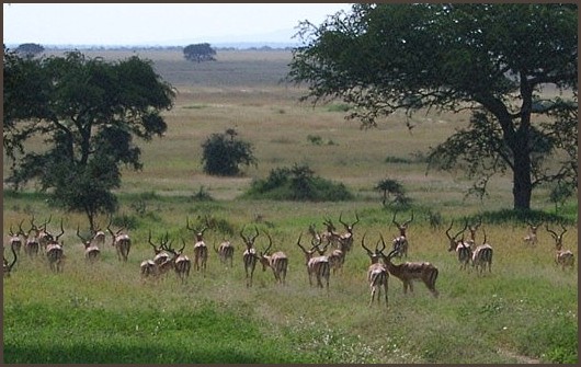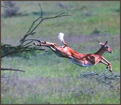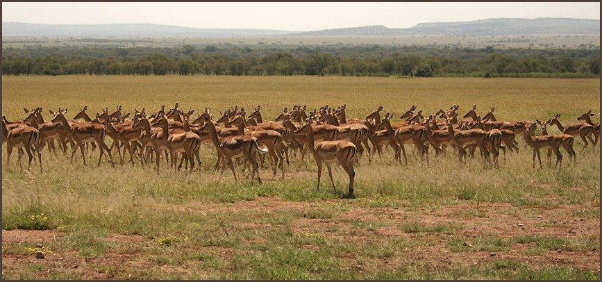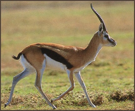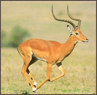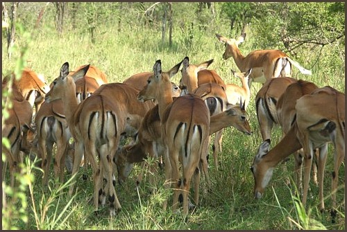 Some people have difficulty distinguishing Impala vs. Grant's Gazelles. ... especially when they're seen together. Well ... other than the fact that the horns are different ... and Impala are bigger ... it's real easy. The markings on the rear end of the Impala ... look like the McDonald's emblem. |