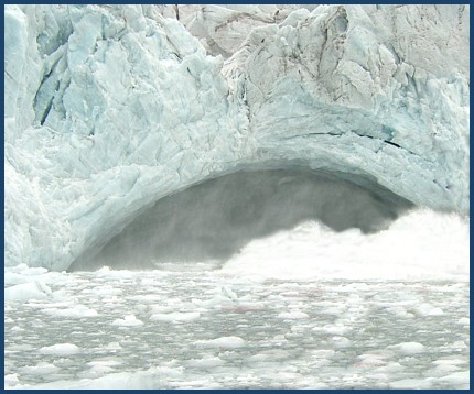 She STILL WASN'T FINISHED. After a few more minor "plops" ... she dropped a fairly large section. Bigger waves ... and we were happy our zodiac driver was adept at "surfing".