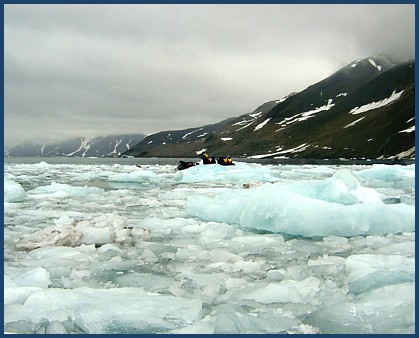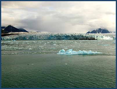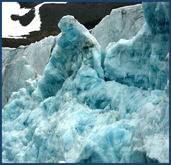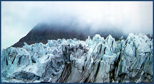 Just about the time the clouds rolled in ...( which can happen almost instantaneously ) ... we heard the distinct sound of the glacier "calving". Arriving at the spot ( marked by all the new ice chunks floating around)...we were a bit disappointed to have missed it. We had never been this close during a calving before. But the old girl still had a few tricks up her sleeve .... and put on another show for us. Like most of us ... if you've ever seen a calving before , it was probably from a ship. So you've probably never given much thought to the waves that occur as a result of huge chunks of ice dropping into the sea. It's quite an interesting experience in a zodiac. |