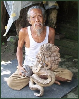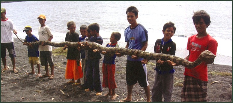 But ... the "capper" of the day was this 18 ft. Reticulated Python ... which had been killed just a couple of hours before our arrival. They were sorry to have killed it ... and would have led us to it's "home" so we could see it .... but it was on the prowl in the village, posing a threat to the animals and small children. But they "saved" it for us to see. ( they probably had it later for a village meal ) |
