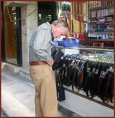 Nooooo ..... Roy isn't uncomfortable about being one of the few Americans in a local Arab market. He just automatically morphs into his "fight or flight" stance whenever he gets near anything that looks like a shop. |