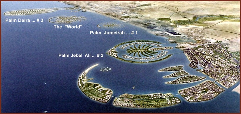 This is an Artist's rendering of the Palms & The World. I've indicated the individual project names... and the order of construction priority. ( The "World" is being worked on simultaneously with all of the Palms.) |
