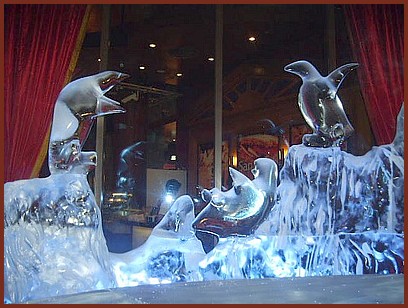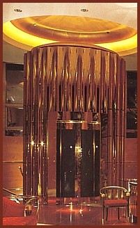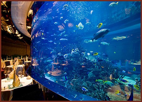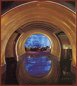 The elevator ( on the left) gives you a 3 minute simulated submarine ride .... with wrecks & sea life ... on it's way down to the restaurant, which is 60ft. underwater. |