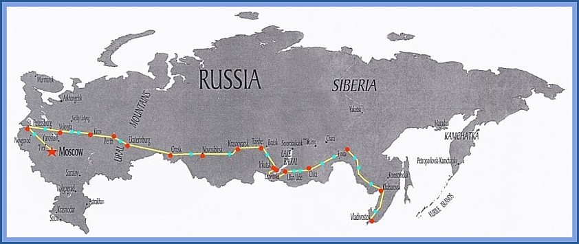Russia covers 12 time zones ..... and on this trip, we crossed 8 of them. ( we had visited 4 others on previous trips). The trip from Moscow to Vladivostok is a 5,772 mile ( 9,288 km ) journey across seemingly endless plains and forests ...dotted here & there with a few cities & villages. If you want a feel for the vastness....just rewatch that train ride segment in "Dr. Zhivago". It's not a trip to take in the winter !! The red dots indicate notable stops on our trip. The blue dots were "pit stops".