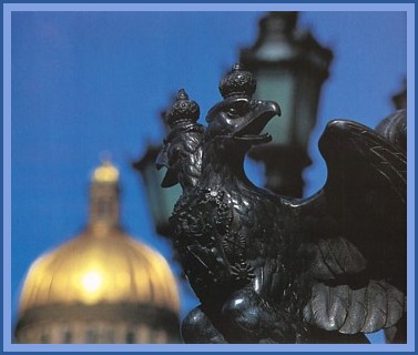 The double-headed eagle ...symbol of Tsarist Russia ...with the gold dome of St. Isaac's in the background. |