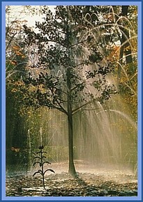 My particular favorites are the "trick fountains" ( such as the one at the right ). This particular one, has 5 metal tulips ..... with 2 benches nearby. Now... when you bend down to look closely at a tulip ... ( stepping on some stones to get that close ) , hidden "triggers" under the stones activate jets of water that squirt you in the face. Surprised ... you usually take several steps back , toward the oak tree. At that point, hidden pipes in the oak spray you with water. As you retreat toward the safety of the benches , another device is activated ......... and you get it again !! I think Peter and I would have gotten on together famously !!! |