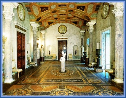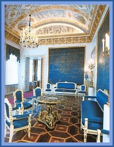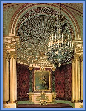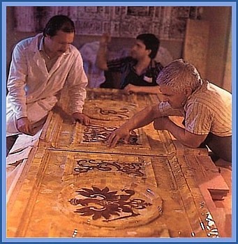 Luckily, old photos ( such as the one at the left ) ....as well as drawings, have been found. So painstaking and costly years have been spent, in an effort to recreate these intricate mosaic panels, for installment in their original state at the Catherine Palace.