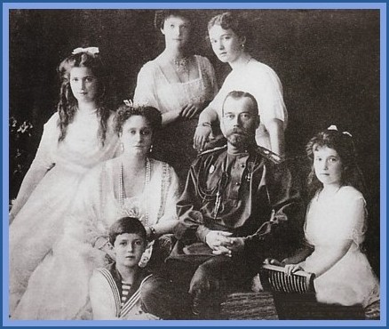 center: Tsar Nicholas & Alexandra ( grand-daughter of Queen Victoria) children: .. clockwise from bottom left: Alexei - Tatiana - Marie - Olga - Anastasia. |