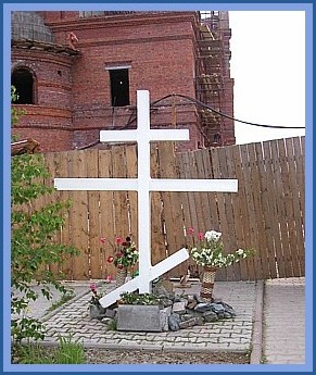 This cross marks the site of the murder. The Romanov family is in the process of erecting a memorial church ( to the right of the cross) .... and also a memorial museum ( seen behind the cross ) |
