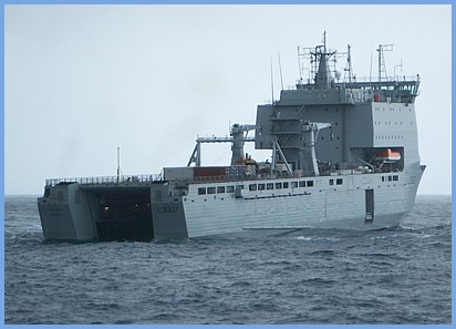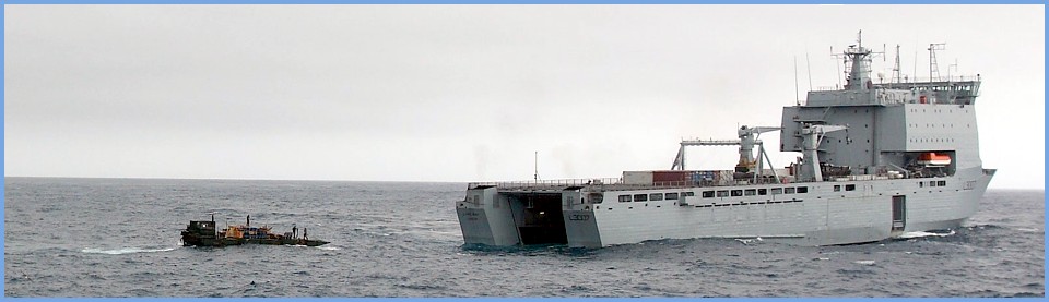 50 engineers of the Royal Fleet Auxiliary ( there to repair the harbor breakers ) struggled all day long trying to maneuver the equipment barge into the hold of their ship. |