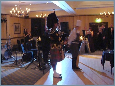 Ahhhhhh ...... the sound of the pipes !!! Not another like it in the whole world. So haunting ... and yet I've always thought, depending upon the song, fearsome enough to send the bravest enemy running for cover. As we were "piped" to dinner, it seemed as if the spirits of the ancestors joined us ... ready to party. |