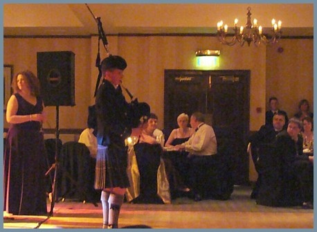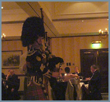 After we were settled ..... the Haggis was piped in and presented to the gathering .... and then the "Ode To The Haggis" was recited. It was the first time we had ever eaten haggis ..... and it really wasn't bad. ( as long as you didn't let the knowledge of the properties infiltrate your brain ) Of course, I guess the same holds true for what you get at a fast-food restaurant, too. |