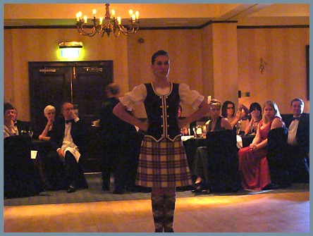 Later, we were entertained with songs and dancing. And then the "lid came off "... as the whole room got going on a never-ending succession of very vigorous Scottish Reels...... kilts & gowns flying in circles of color. |