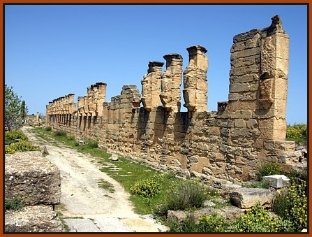 This wall faced one of the streets in the city. Each one of those mini-pillars was a carved statue. You can still recognize some of the faces. |