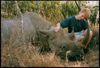 AFRICA...Indulging in a "hug-in" with the oldest Rhino on the Reserve.. He was so responsive. What a sweetie. |