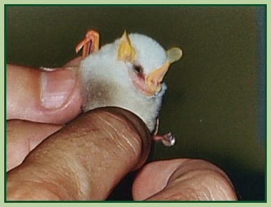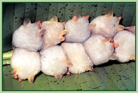 These are White Tent Bats. Cute little things aren't they ? They are so tiny that they gather together on the underside of leaves, for their naps. No cave-hanging for these guys. |