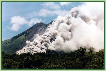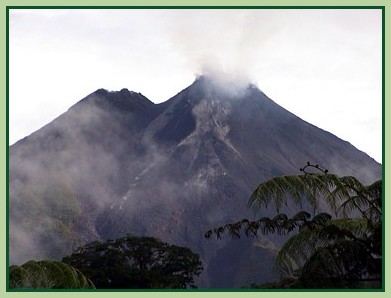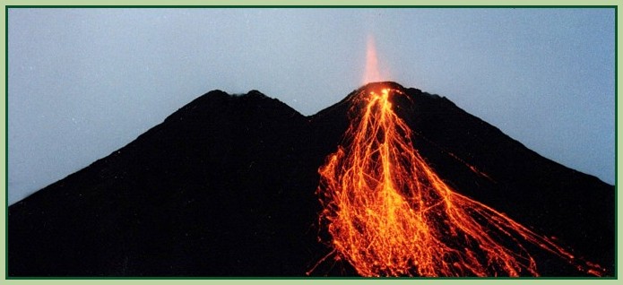 One morning , the volcano was spitting lava "bombs" which were making big "puffs" as they bounced down the slope. You may be able to pick out a few of these. |